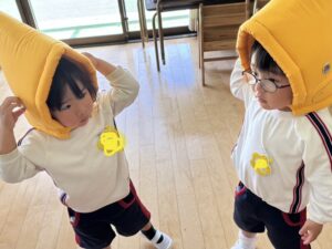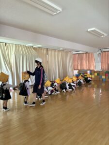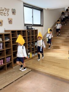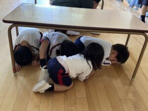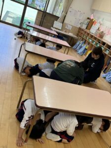 年少さんは、初めての避難訓練(緊急地震速報の音)に驚き、泣いてしまう姿も見受けられましたが、一斉に机の下で頭を抱え、ダンゴムシのポーズのように丸くなることができました。
