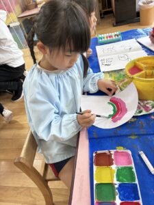 年中さんは、うろこを好きな色の絵具で塗り、飾りをつけました。