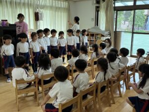 今日は、「朝の会」の時間に、お手本として、年長さんがお手伝いに来てくれました。